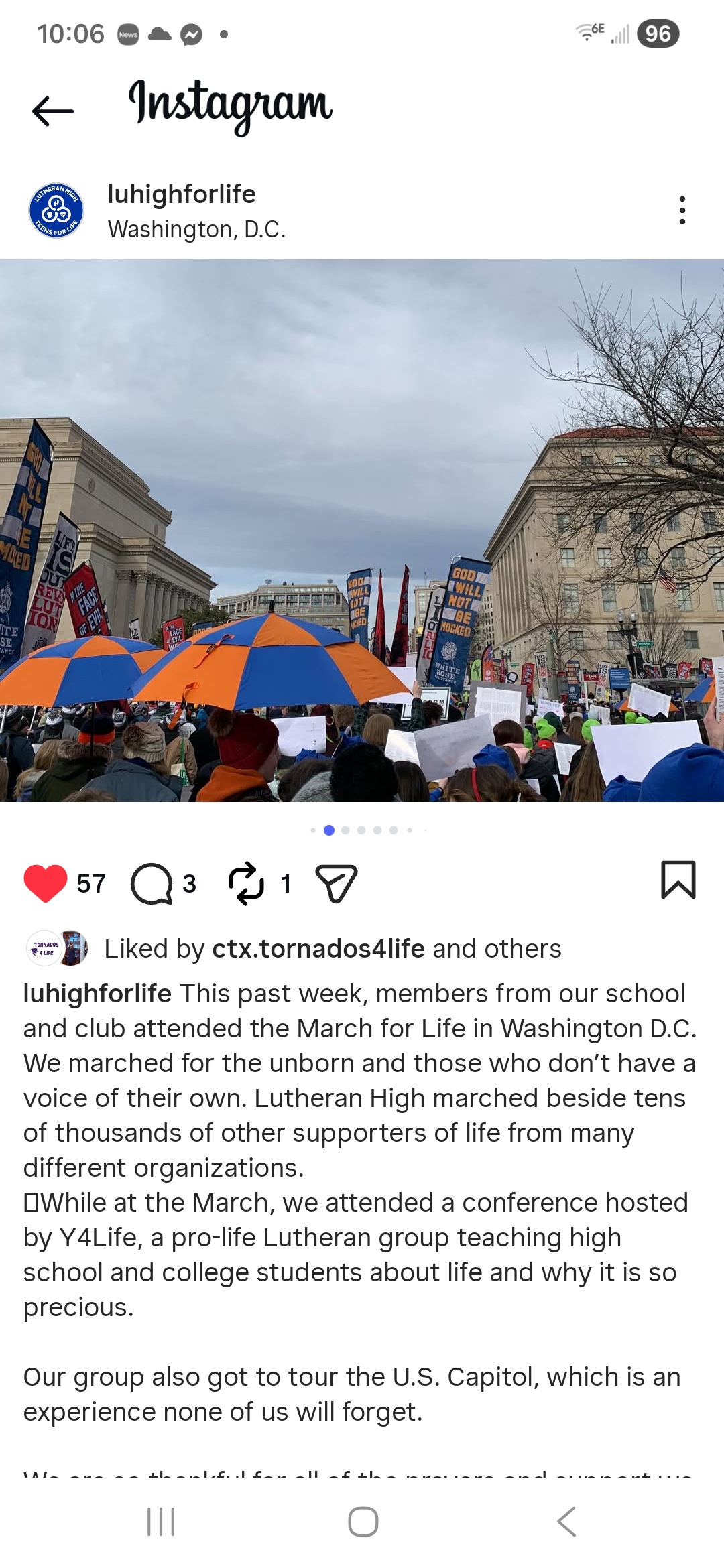 “Our group from Lutherans For Life, which numbered over 550 youth and adults, marched side by side with many other Lutherans from the LCMS and NALC. We sang hymns together, prayed, and praised God for the lives He creates, redeems in Christ, and calls to Himself through the Holy Spirit.